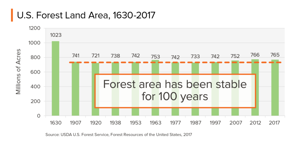 Forest area in the U.S. has been stable for more than 100 years, despite a huge increase in population. By conservative estimates, the U.S. was home to 76 million people in 1900 and there are more than 330 million people today. And yet, as shown in the graphic below, we have about the same amount of forested land as we did at the turn of the last century.
