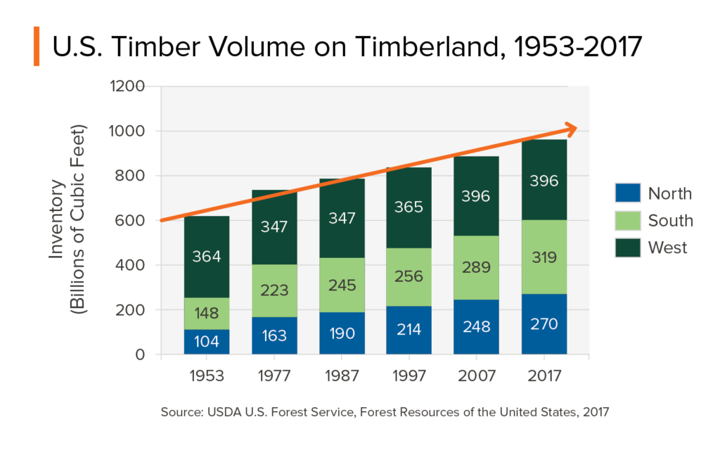 In addition to a stable amount of forested land overall, the U.S. has experienced an increase in the volume of trees on its timberlands—also known as “working forests.” These are the lands available for timber harvesting and do not include national parks or wilderness areas. An increase means net growth of tree stock, while a decrease would mean an overall loss of tree stock. The data considers all losses, including natural mortality, wildfire, and harvesting. Since 1953, the volume of timber on these lands has increased by 60%, as illustrated in the graphic below.2 Less than 2% of working forests are harvested each year.3