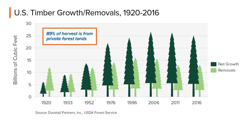 Forest growth vs. removals is another measure. The graphic below shows growth and removals on U.S. timberlands. Again, it can be seen that growth outpaces removals.